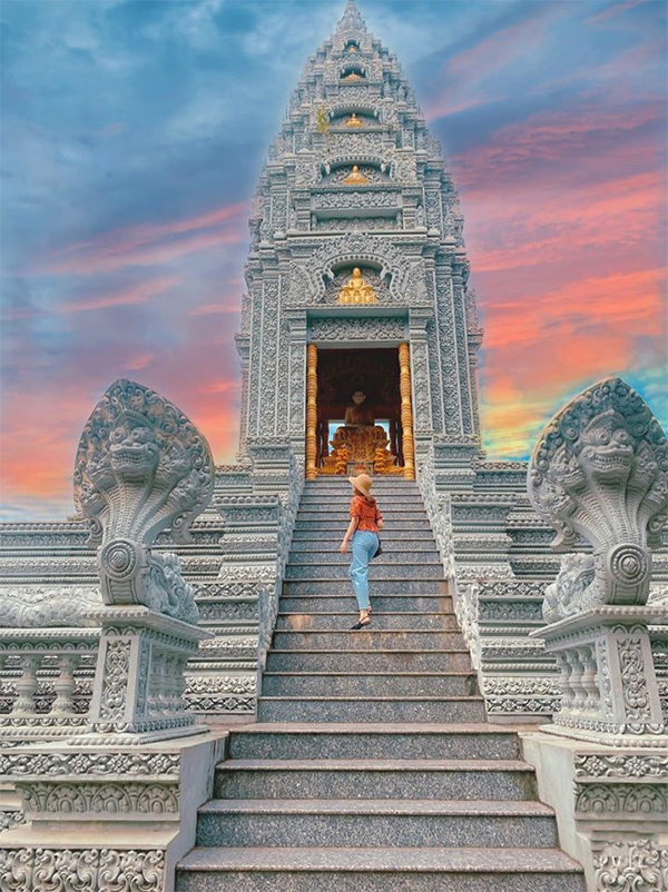 Chùa Wat Pătum Wôngsa Som Rông trở nên thơ mộng hơn vào buổi xế chiều, đến đây giờ này du khách không chỉ lễ chùa, cầu bình an mà còn có thể tậu về một album ảnh ấn tượng, độc đáo.