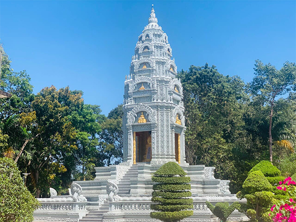 Khuôn viên chùa được chia thành nhiều khu vực khác nhau, nổi bật nhất là ngôi bảo tháp được đặt ngay lối đi vào chùa và song song với ngôi chánh điện. Ngôi bảo tháp có bốn hướng và có bốn lối đi, là đại diện của từ, bi, hỷ, xả. Dọc hai bên lối dẫn lên bảo tháp được trang trí hình tượng rắn thần Naga và mô típ các hoa văn Khmer cổ được trạm khắc rất tinh tế, sắc sảo.